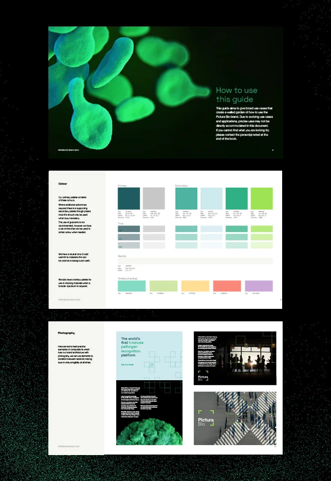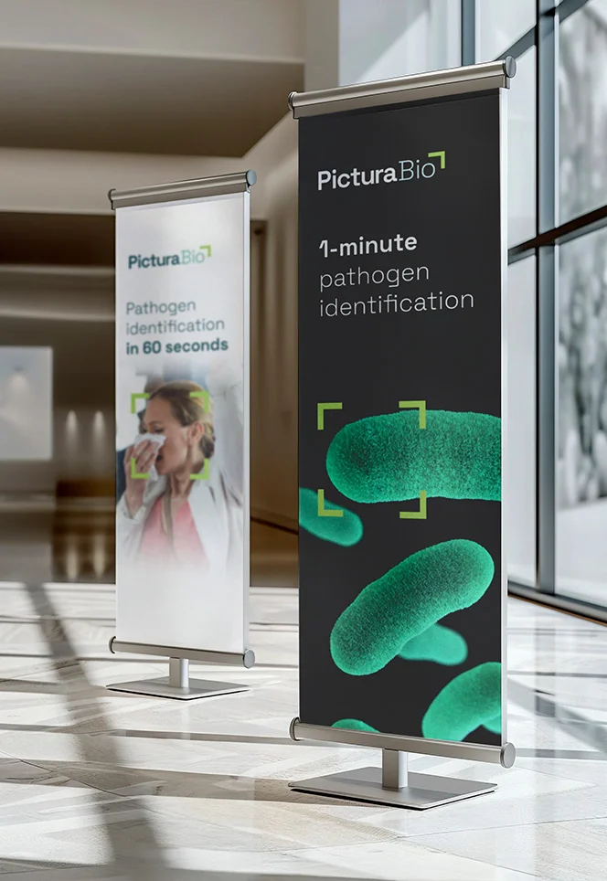 We started by interrogating the technology, the category and the goals of what this company was going to deliver. Their new name, Pictura Bio, leads with what makes them different: their recognition technology paints and photographs respiratory samples as a new method for identifying pathogens. With redeveloped tie-in names for their hardware and software (VISTA and PIC-ID), we created a full ecosystem that worked in obvious harmony. The supporting design environment - which draws on the grid work and viewfinder imagery one would find in digital photography - visually reinforces this ecosystem, while also evoking the speed and precision Pictura Bio delivers.