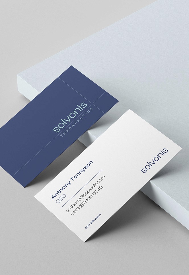 Our aim was to deliver a practical, unique visual ID that has scope for evolution whilst aligning with the core principles of the brand. Solvonis is unquestionably a therapeutics brand. Purposefully clinical, precise, unfussy. The white space used effectively to frame the information without any unnecessary fluff. This brand is focused squarely on results, and its upcoming clinical trials across two products in its pipeline demonstrate this focus brilliantly.
